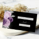 This elegant, modern wedding table reserved seating place card features a purple and silver faux glitter floral design along one edge on a black background. The front of the card provides space for the guest's name and table number in the form of silver gray rectangles. The word "table" appears in silver gray handwriting script with swashes before and after. Customize the back of the card with the names of the bride and groom in silver gray handwriting script and the wedding date below in sans serif font.