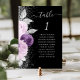 The left-hand edge of this elegant wedding table number sign features a floral bouquet in shades of purple and lavender, trimmed with silver faux foil and faux glitter foliage and sprinkled with silver faux glitter. The word "table" appears in silver gray whimsical handwriting script on a black background. Add the names of your guests who are assigned to each table.
