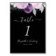 The top edge of this elegant modern wedding table number features a floral bouquet in shades of purple and lavender, trimmed with silver faux foil and faux glitter foliage and sprinkled with silver faux glitter. The word "table" appears in silver gray whimsical handwriting script on a black background, with the number below, along with the names of the couple and the wedding date.