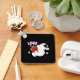 With a design featuring a cartoon-style white rabbit hugging a red heart with the word “LOVE” on it. Surrounding the rabbit are small white flowers. The background of the keychain is black, and it has a silver-colored ring and chain attached to the top.