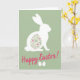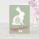 This design shows a white rabbit silhouette centered on a muted sage-green background that feels like early spring. Inside the rabbit’s body, an egg-shaped window reveals a soft cream backdrop sprinkled with green leaves and fuchsia-pink flowers, like a small bouquet tucked close. The gentle contrast between the crisp white outline and the floral interior gives the rabbit a tender, friendly presence 🐰. Near the bottom, the words “Happy Easter!” sit centered beneath the rabbit in magenta lettering, standing out clearly against the green. Two small white oval accents appear nearby, echoing the egg shape and adding a quiet sense of togetherness 🐇. The overall layout stays simple, letting the floral pattern carry a hint of romance, like a shared glance between two people in a garden. The flowers are scattered in small clusters, with bright pink petals and leafy green sprigs resting on the pale interior shape.