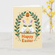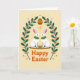 This card shows two stylized white rabbits facing each other with gentle smiles, leaning in as if sharing a quiet, friendly moment 🐰. Each rabbit wears a small floral garland around its neck, mixing pink and yellow blooms with leafy green accents for a sweet, romantic touch. Around them, a curved wreath of green foliage forms an arch, dotted with yellow and pink flowers and tiny orange berries that guide your eye back to the pair. Near the top of the wreath sits a decorative egg shape with warm orange and brown stripes, tying in with the floral colors below. The background is a pale creamy tone with small round dots and a few star-like sparkles scattered lightly, adding a soft celebratory feel 🌷. Near the bottom, a short Easter greeting is set in rounded orange letters, centered and easy to read against the light backdrop. The rabbits’ ears angle slightly inward toward each other, and the wreath’s leaves curl neatly around them in a smooth oval frame. A striped orange-and-brown egg rests at the wreath’s highest point above the rabbits.