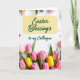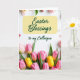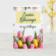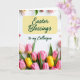 This design shows a pale yellow, softly rounded rectangle centered on a white background, like a little note tucked into a garden. In the upper half of that panel, deep green lettering sits prominently, with the message centered and easy to spot. Along the bottom edge, a dense row of tulips rises upward, their closed blooms mixing tender pinks with sunny yellows, as if they’re leaning in together like close friends 🌷. Green leaves and stems weave between the flowers, adding layered texture and a gentle sense of closeness. Near the top edges, small sprigs of light pink and peach blossoms scatter outward, softening the space around the text like a quiet, affectionate frame. The lighting looks airy and diffused, giving the petals a smooth glow and keeping the background bright and open. The tulips form a thick floral border across the lower third, while the small blossoms lightly dot the upper corners 🐇.