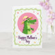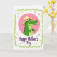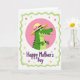 On the front of the card is an emerald-green, cartoon-style reptile standing upright with a friendly smile and small, simplified teeth, giving the scene an easy, affectionate feel ❤️. It wears a wide-brimmed sun hat topped with two soft pink flowers, like it dressed up to greet someone special. The character’s arms are slightly open, suggesting a gentle, welcoming hug that reads as caring and warm. A blush-pink circular frame sits behind the character, centered on a white background that keeps the focus on the tender pose. Around the edges, a double, wavy border in spring green creates a scalloped look that feels light and celebratory. Small confetti dots in pastel coral, yellow, and mint green are scattered across the white space, adding a breezy, friendly energy 🌼. The words “Happy Mother’s Day” appear near the bottom in deep purple, flowing lettering, neatly placed below the character. The hat’s brim curves softly above the pink blossoms, with the blush circle sitting directly behind the character’s head and shoulders.