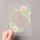 A modern and elegant save the date card printed on clear acrylic. Featuring soft watercolor roses, gold geometric accents, and a sophisticated transparent background, this design is perfect for couples who want a stylish and unique way to announce their wedding.