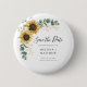 Create a modern Sunflower Floral save the date button with this cute template featuring beautiful rustic floral bouquet, geometric gold effect frame, with modern simple typography.