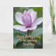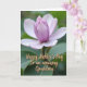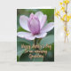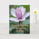 This card features a large, partially opened flower placed slightly above the center, drawing your eye into its gentle unfolding ❤️. The inner petals glow with a soft lavender tint that fades outward into pale, almost translucent white along the broader edges. Behind it, the background melts into a smooth blur of leafy greens, keeping the focus on the bloom and giving the scene a quiet, intimate feel. Diffused natural light brushes across the petals, revealing velvety textures and subtle color shifts that feel like a tender glance shared between close friends. The tightly curled center suggests a soft, budding closeness, as if the flower is leaning in rather than fully showing off. In the lower part of the design, a short dedication appears in flowing, connected lettering, set in a warm golden tone that stands out gently against the green wash 🌼. The gold text sits low and slightly to one side, leaving the flower’s pale edges unobstructed against the softly blurred green backdrop.