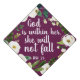 Beautiful grad cap topper features the scripture quote "God is within her, she will not fall" from Psalms, in white brush script lettering on a rich plum purple background adorned with white watercolor flowers and green foliage. Personalize with your class year.