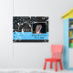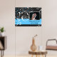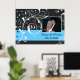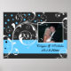 Elegant floral scroll leaf black, blue flourish wedding photo poster print, featuring white scroll leafs, swirls and curls and sky blue dots on black background. There is a blue band with your text to the bottom. The blue can be changed to any color. Classy, stylish and chic design with your photo.