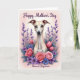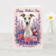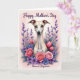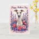 Designed with a graceful sighthound-like dog at the center, the illustration focuses on its slender neck, smooth cream coat, and warm brown eyes that meet yours with a tender, affectionate look ❤️. A full floral wreath surrounds the dog like a gentle embrace, suggesting closeness and quiet devotion through the way the blooms cradle its face. Soft pink roses gather along the lower area, paired with small purple and calm blue blossoms that fill the sides with layered petals and leaves. Tall, slender purple flower stalks rise up both edges, guiding your eye upward and giving the layout a romantic, garden-framed feel. Small pink tulip buds are tucked between greenery, adding a fresh, friendly note as if the bouquet was just gathered. The background fades from white into a light blush pink, and the soft lighting brings out the fine textures in fur and petals 🌼. A flowing message line sits above the wreath and another line appears below it, both set in a dark gray tone that stands out gently against the pale backdrop. The flowers include pale pink roses at the bottom with clusters of purple blooms and blue blossoms around the sides, plus thin purple stems reaching toward the top.