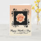 This greeting card features a large rose in the center, with petals opening in coral and peach tones that feel like a gentle embrace ❤️. The bloom sits inside a deep black square that adds strong contrast and draws your eye straight to the flower. Around that square, black silhouettes of leaves and small blossoms spread outward like a quiet garden border, as if they’re leaning in close together. The background fades from a blush peach near the top down to a creamy ivory at the bottom, giving the scene a soft, intimate glow. Near the lower portion, a flowing message line appears in dark lettering, placed beneath the main floral image and centered for balance 🌼. Fine shading inside the rose’s spiral and along the outer edges suggests a tender, romantic light falling across the petals. Delicate highlights trace the petal rims, while the surrounding foliage remains matte and inky against the pale gradient. The black botanical shapes curl along the sides and corners, framing the square like a lace-like border.