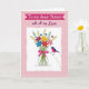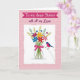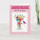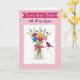 This card features a bouquet of stylized flowers arranged like a loving gift, with deep red, sunny yellow, calm blue, soft fuchsia, and rich purple blooms tucked into fresh green leaves ❤️. The stems sit in a lightly outlined clear vase, and a pink ribbon is tied around it as if someone just set it down for a dear friend or sister. Off to the right, a small bird in fuchsia and deep indigo perches near the flowers, its bright white eye turned toward the bouquet with a tender, admiring look. The main illustration sits inside an irregular white frame that feels like a cozy cutout against the background. Behind it all is a blush-pink field scattered with many faint heart shapes, adding a gentle romantic tone without overpowering the scene 🌼. Across the top, a wide fuchsia banner holds the message “To my dear Sister with all my Love” in light-colored lettering, centered and easy to read. The banner stretches above the framed artwork, while the bird remains to the right side, angled inward toward the vase and flowers. Tiny pale hearts repeat across the pink background around the white frame.