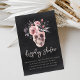 A spooky chic bridal shower enclosure card design featuring a floral skull illustration topped with pink and purple watercolor flowers on a smoky black background. Add this display shower enclosure card to your bridal shower invitations to encourage guests to bring their gifts unwrapped.