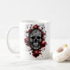 A gothic-inspired artwork blending a detailed skull with vibrant red roses and intricate vine patterns, symbolizing the duality of life and death.
