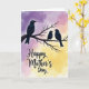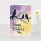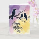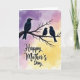 This card features three dark-feathered birds perched together on a bare, twisted branch, with the larger bird on the left turning its head toward two smaller birds tucked close beside it in a gentle, caring pose ❤️. Behind them, the sky fades from soft lavender at the top into warm pink tones and then into a glowing golden yellow near the bottom, like early morning light. The close spacing of the two smaller birds and the calm, watchful angle of the larger one suggest a quiet bond, like a tender family moment shared in silence. Fine feather details and the rough texture of the branch add a natural, cozy touch without crowding the scene. The message “Happy Mother’s Day” sits in the lower half of the design, centered and easy to notice. The lettering is dark and flowing against the pale background, standing out clearly while still feeling gentle 🌼. Wispy clouds drift across the color-washed sky behind the birds, and the branch stretches diagonally with small knots and bends.