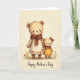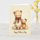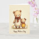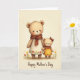 The front design shows two plush, animal-like figures standing close together, the taller one in a cream smock dotted with small red-and-yellow flowers and a terracotta scarf, while the smaller one wears a marigold dress with matching floral accents and a russet bow. The smaller figure curls its hand around the taller figure’s fingers, and their rosy cheeks and gentle, sideward glances suggest a caring bond ❤️. Behind them, a warm parchment-toned backdrop with a faint texture gives the scene a cozy, old-fashioned feel. A few simple flower sprigs in red and yellow sit near their feet, echoing the patterns on their clothing and adding a soft garden touch 🌼. Light falls evenly across their fuzzy faces and rounded forms, bringing out the folds in the scarf and the ruffle at the smaller figure’s collar. Along the bottom edge, a short line of text is centered in a flowing cursive style, colored in a deep, warm red. The bow on the smaller figure’s head is tied neatly, with two short ribbon tails pointing down toward its shoulder.