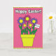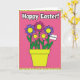 Designed with a bright spring palette, this card centers on a bouquet of stylized flowers arranged in a sunny yellow, tapered vase, like a friendly gift set out for someone special 🌷. Five large blooms sit on a rosy pink panel, with petals alternating between lavender and magenta and each flower holding a small yellow center that seems to glow. Green stems and leaves spread outward and overlap slightly, creating the kind of close, cozy clustering that feels like companionship in picture form. Across the top, a seasonal greeting appears in thick white letters with a dark outline, standing out clearly against the hot pink background. A dashed border frames the central panel, adding a neat edge before the design opens into a lime green margin dotted with darker spots. Near the upper right flowers, a small white rectangular tag is tucked in at an angle, suggesting a quiet note meant for one person 🐰. The lime green spotted frame wraps around the pink center, while the yellow vase sits firmly at the bottom of the bouquet.