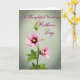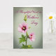 On the front of the card is a slender green stem rising slightly left of center, topped with a wide-petaled pink flower that opens outward like a gentle embrace ❤️. The petals shift from soft blush at the edges to a deeper berry tone near the center, where small yellow stamens sit like tiny points of light. Just below it, a second bloom is a bit more closed, echoing the same color blend and leaning close as if keeping the first flower company. Serrated green leaves cluster along the stalk, adding a grounded, natural frame that feels calm and caring. The background is a muted sage green that fades subtly toward the edges, giving the scene a quiet, airy space 🌼. In the upper right, the message “A Thoughtful Word on Mother’s Day” appears in a flowing berry-colored style, set against the open background so it stays easy to read. Soft, diffused lighting brings out the petal texture and leaf veins without harsh shadows. The text sits above the blossoms on the right side, while the flowers and leaves occupy the left and lower middle of the design.