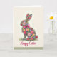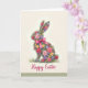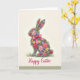 This card features a long-eared bunny silhouette formed entirely from layered leaves and flowers, with a tender, friendly charm suggested by the gentle curve of its posture 🐰. Soft pink and deep red roses mingle with sunny yellow petals and small periwinkle-blue and lavender blossoms, creating a garden-like collage that feels like a sweet springtime gesture. A glossy fuchsia bow sits at the bunny’s neck, like a dressy touch you might add for someone you care about 🌷. The figure stands on a small patch of stylized green grass, keeping the scene grounded and calm. Behind it, the background is creamy ivory, leaving lots of open space so the floral bunny stays the clear focus. Along the lower area, a greeting is placed beneath the bunny in deep magenta lettering, centered and easy to spot. A softly scalloped decorative border runs near the bottom edge in a light, subtle tone.