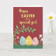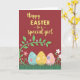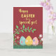This card features a deep maroon background that feels cozy and festive, with a soft spring garden scene spreading across the lower half 🌷. Near the top, bright yellow text reads “Happy EASTER — to a — special girl,” with “Happy” and “EASTER” in flowing lettering and the smaller words set in a simpler, thicker style. The lettering sits centered and glows against the dark backdrop, like a warm note meant for someone close. Along the bottom, lush green grass supports a pale green vine that curves in from the left, dotted with darker leaves and tiny pink star-shaped blossoms 🐰. White flowers rise taller behind smaller pink blooms, creating a layered field that suggests a gentle, caring attention. Nestled in the grass are three decorated egg shapes—one sky blue, one sunny yellow, and one blush pink—arranged like a sweet trio sharing the space together. Each egg carries delicate patterns such as tiny flowers, starburst shapes, and thin bands that add texture without crowding the design. The vine’s arc leads the eye toward the eggs on the right, where the pink egg shows small floral details and fine striping near its center.