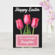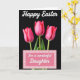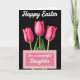 This design shows three fuchsia flower buds in the center, their petals tightly curled as if leaning toward one another like close friends 🌷. A deep black background makes the pink tones stand out, while soft, angled light picks up fine petal texture and gentle highlights. Thin green stems and a few small leaves rise from below, adding a fresh spring touch without crowding the scene. Near the top, a short Easter greeting appears in white, flowing lettering, centered and easy to spot. At the bottom, a rectangular message area sits neatly in place, edged with a light pink-and-white gingham border. Inside that panel, a brief dedication is written in matching white, flowing lettering, spaced to feel balanced and calm. The contrast between the dark backdrop and the bright blooms creates a quiet, romantic mood, like a shared glance that lingers 🐇. The lower panel’s border forms tidy little squares in pale pink and white around the message box.