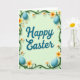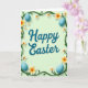 This greeting card features a pale mint green background with a deep teal message centered in the middle, set in flowing lettering with a faint shadow for gentle depth. Around the text, curling green vines form a loose frame, like they’re leaning in to hold the words close in a friendly, caring way 🌷. Scattered through the greenery are five-petaled flowers with white edges that fade into warm yellow-orange centers, creating soft contrast against the cool backdrop. The blossoms vary in size, giving the border an easy, natural rhythm as your eye moves around the card. Four smooth egg shapes in a calm blue sit near the corners, adding little spots of discovery that feel like they were placed with quiet affection 🐰. The overall palette stays light and springlike, with subtle highlights that make the leaves, petals, and eggs look softly lit. The message remains the focal point, with generous space around it so the border feels like a gentle embrace rather than crowding the words. In the corners, the blue eggs rest just inside the vine frame, with small blossoms and leaves nearby.
