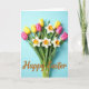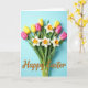 This design shows an overhead view of a spring bouquet laid across a calm, clear blue background, like a fresh note passed between close friends. Yellow tulips and deep pink tulips sit at the center, their petals leaning toward one another in a way that suggests a tender, shared moment 🌷. Star-shaped white flowers are tucked between them, each with a bright orange-yellow trumpet that draws the eye like a small spark of affection. The stems and slim green leaves are gathered neatly and set on a diagonal, guiding your gaze from the upper right down toward the lower left. Soft, diffused light smooths across the petals and leaves, letting gentle textures show without sharp shadows. A seasonal greeting appears in the bottom-left corner in warm, earthy brown lettering, standing out clearly against the blue. The blue field stays uncluttered, while the bouquet’s greens, yellows, pinks, and white blooms create a lively contrast 🐇. The orange-yellow centers of the white flowers glow against the cool background near the lower half of the bouquet.