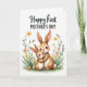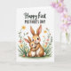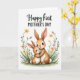This card features two long-eared, humanlike creatures cuddled close, with the larger one gently holding the smaller as their wide eyes and rosy cheeks meet in a tender, affectionate moment ❤️. Their coats are shaded in warm caramel and creamy beige, giving the rounded shapes a soft, cozy look against a plain white background. Around them, slim green stems rise with small blossoms in yellow and coral, like a quiet spring border that adds a friendly, romantic softness to the scene 🌼. A light green wash sits near the bottom edge, grounding the figures and flowers without crowding the center. Near the top, a flowing line of green text sits above a second line of darker lettering in black, creating a clear, stacked message area. The lettering is centered and spaced to leave plenty of breathing room around the illustration. The overall artwork mixes gentle watercolor-like shading with crisp edges, keeping the characters’ faces and the flower details easy to notice. The blossoms curl inward from both sides with tiny yellow petals and coral accents on thin stems.