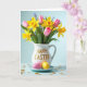 Designed with a spring tabletop scene, the card centers on a white ceramic pitcher that feels like it was set down for two close friends to admire together. Across the pitcher, raised gold lettering sits prominently in the middle, forming a cheerful seasonal greeting. A full bouquet spills out above it, mixing golden star-shaped blooms, soft pink cup-like flowers, and a few small deep-blue spikes tucked into leafy green stems. The gentle lighting and airy blue background give the arrangement a tender, shared-moment feel, like a quiet glance exchanged over fresh flowers 🌷. Below the pitcher, a pale blue saucer holds two smooth egg-shaped forms in pastel yellow and pink, their glossy highlights suggesting careful placement side by side 🐰. Tiny gold confetti-like dots are scattered around the base, catching light in little flashes. The surface beneath everything is a calm, light cerulean blue with the gold accents gleaming against the cool tones.
