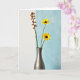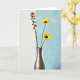 This card features a carefully arranged still-life scene centered on a sleek, metallic vase holding three botanical stems, like a quiet offering between close friends ❤️. Two slim green stalks rise upward, each topped with a sunlit yellow flower whose soft petals spread around a deep, dark center, leaning slightly as if drawn toward one another. Beside them stands a rougher stem with a row of plump, fuzzy orange buds or seed pods, adding a cozy texture that feels gently affectionate. The background is split straight down the middle, giving the scene a calm, balanced stage. On the left is a bright white wall, while on the right is a soft sky-blue area with faint cloudlike mottling 🌼. Any greeting text sits near the top in a simple dark tone, with a smaller line near the bottom in a lighter shade to keep the focus on the flowers. The even lighting highlights the vase’s smooth shine, the fine fuzz on the pods, and the crisp edges of the yellow petals against the white-and-blue backdrop.