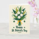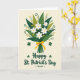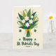 Designed with a creamy ivory background, this St. Patrick’s Day card centers on a bouquet that feels like a friendly gift being offered with a gentle, close-to-the-heart touch 💚. Crisp white five-petaled flowers with sunny yellow centers rise from layered green foliage, mixing deep emerald and softer olive leaves that curl and unfurl like they’re leaning toward one another. Tiny yellow heart-shaped buds dot the stems, adding little hints of affection among the greenery. A golden-yellow ribbon wraps the stems and ties into a neat bow, warming the middle of the design and drawing your eye downward. Near the base, small dark-green shamrocks sit to either side like quiet companions, tucked in close ☘️. Below the bouquet, the words “Happy St. Patrick’s Day” appear centered in deep forest green, with the lettering flowing smoothly across the lower portion. Petite shamrocks and a small leafy flourish accent the area around the text, framing it without crowding it. The bouquet’s bow sits just above the centered greeting, with two small shamrocks flanking the stems against the ivory space.