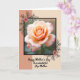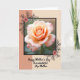 This card features a fully bloomed rose centered inside a thin black rectangular frame, its petals shifting from creamy peach at the curled middle to soft pink along the edges, like a gentle blush shared between close loved ones ❤️. Soft light highlights the velvety layers, drawing your eye inward as if lingering on a tender moment. Behind the frame, the background is split vertically with warm terracotta on the left and pale beige on the right, creating a calm, balanced setting. Dark botanical flourishes decorate the top-left and bottom-right corners, each accented by a small coral-pink blossom that adds a sweet, affectionate touch 🌼. Near the bottom, the greeting text reads “Happy Mother’s Day to a wonderful Step Mother,” placed in a flowing, cursive-style font in a dark tone for easy contrast. The wording sits centered beneath the framed rose, leaving comfortable space around it so the layout feels open and thoughtful. Fine petal edges and gentle shading give the flower a lifelike depth against the two-tone background and corner decorations. The small coral blossoms sit tucked into the corner flourishes, one at the upper left and one at the lower right.