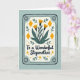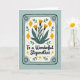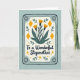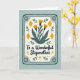 This design shows a calm botanical frame wrapped around a creamy off-white rectangle, setting a gentle, affectionate tone like a quiet hug between close family ❤️. A rounded border in muted blue-grey with a darker teal edge encloses the center panel, with small sunburst shapes tucked into the corners and dotted accents nearby. Three stylized, bell-shaped flowers in warm golden yellow rise from the bottom, their deep teal stems and broad leaves leaning toward each other as if sharing a tender moment. Small green leaf sprigs and tiny golden diamond shapes float around the blooms, adding a light, celebratory sparkle 🌼. Centered beneath the flowers, the main message reads “To a Wonderful Stepmother,” in a flowing dark teal lettering that stands out clearly on the cream background. Additional tiny gold dots are scattered across the panel, giving the space a soft, confetti-like glow without feeling busy. The overall palette blends cream, teal, golden yellow, and cool blue-grey in a flat, graphic folk-art look. The border’s rounded corners and teal outline frame the text while the golden diamonds sit between the leaves on the open cream field.