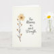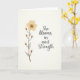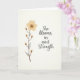 Designed with a creamy white background that feels calm and open, this card pairs botanical art with a gentle message ❤️. On the left, a slim floral stem rises upward, suggesting steady growth like a quiet companion by your side. Near the top, one main flower opens into five almond-toned petals around a dark brown cluster at the center, with a few small buds tucked along the stem as if waiting their turn. Muted green leaves branch out softly, adding a tender, caring touch to the arrangement. On the right side, the phrase “She blooms in quiet Strength” is placed in dark lettering, with “Strength” set slightly larger for emphasis. The text sits comfortably in the open space, balancing the flower without crowding it, like a supportive note shared between close friends 🌼. Subtle earth tones—cream, brown, and soft green—keep the look gentle and grounded, and the single stem stands tall beside the dark phrase on the right.