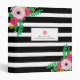A binder for teachers featuring a black and white striped pattern with floral design on front at top left and bottom right. Front features custom text under pink apple illustration.