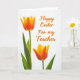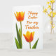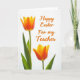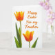 Designed with two tall flowering stems as the focus, the image features a pair of blooms angled toward each other like close friends sharing a quiet moment 🌷. The petals shift from deep orange near the base to soft yellow at the tips, with fine, light-catching lines that make them look gently textured. Fresh green stems and leaves rise beneath them, adding contrast and a calm, natural balance. The background is bright white, and the lighting is luminous, giving the scene an airy springtime feel with a hint of affectionate warmth. One flower lifts higher on the left while the other sits slightly lower on the right, creating a diagonal arrangement that feels connected and attentive. On the right side, orange lettering reads “Happy Easter For my Teacher,” placed over the white space beside the blooms 🐰. The orange text sits near the middle-right area, standing out clearly against the pale backdrop and echoing the warm tones in the petals. The leaves curve upward with smooth edges, and the two blossoms face inward with their yellow tips glowing against the white background.