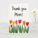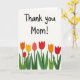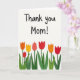 This card features a tall, vertical layout with a soft ivory background that keeps the focus on a simple thank-you message and a garden scene. Near the top, the text reads “Thank you Mom!” in thick black lettering, centered with plenty of open space around it. The roomy margin and high contrast make the words feel direct and affectionate, like a note left for someone you care about ❤️. Along the bottom third, seven rounded, bulb-like flowers line up in a friendly row, their warm reds, oranges, and yellows suggesting a sunny spring day. The petals show gentle, textured shading, giving them a cozy, drawn look without feeling fussy. Deep green stems rise from a base of long, layered leaves in varied green tones, adding depth and a calm, nurturing feel 🌼. A small red flower sits slightly lower among the taller blooms, creating a sweet, intimate visual surprise.