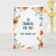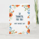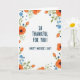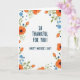 This greeting card features a white background with a garden-like border that wraps around the message like a gentle hug ❤️. In the center, the main line “SO THANKFUL FOR YOU!” sits prominently in a simple sans-serif type, with “HAPPY MOTHER’S DAY!” placed just below it in the same style. Around the text, large orange-red flowers with dark charcoal centers lean inward, as if turning their faces toward the words in quiet affection. Smaller clusters of soft blue blossoms mingle between them, adding a calm, friendly touch that feels like a caring glance shared between loved ones 🌼. Slender green stems and leafy sprigs weave through the arrangement, creating a natural frame without crowding the middle. Tiny buds and scattered blue petals add little pauses of detail that make the border feel alive and attentive. The orange-red blooms sit at the corners and sides, while the blue flowers fill the gaps, all set against the open white space.