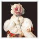 Vintage painting remix of a woman wearing a vintage white dress with puffed sleeves holding a peony flower on a stick.