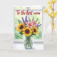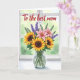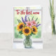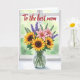 Designed with a sunlit windowsill scene, this card centers on a generous bouquet arranged in a clear, fluted glass vase, with the stems visible through the water for a gentle, intimate touch ❤️. Golden flowers with dark centers lead the arrangement, their faces turned outward like they’re leaning in close, while star-shaped pink blooms nestle between them as if sharing a quiet moment. Soft purple flower spikes rise through the greenery, adding cooler notes that balance the warm yellows and rosy pinks. The vase sits on a bright white sill, and the window frame around it feels classic and simple, with a blurred green view outside that suggests a calm day. Above the bouquet, the message “To the best mom” appears near the top, written in flowing red lettering that stands out against the pale background. The light looks natural and diffused, giving the petals a soft glow and making the glass catch small highlights 🌼. Leaves and stems overlap in a loose, natural way, creating the sense of an arrangement made with care. The background shows a pale window border with a faint green landscape beyond the glass.