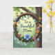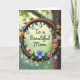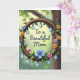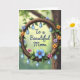 This card features a circular wooden ring that looks like a twisted branch, with small flowers tucked around it in soft blue, orange, pink, and purple, plus fresh green leaves. Hanging from the ring are many translucent, pear-shaped droplets that catch a cool blue glow, adding a gentle romantic sparkle ❤️. Behind everything, the background is softly blurred with light spots, shifting from sunny green to deeper earthy tones like a quiet garden at golden hour. Centered inside the ring, the message “To a Beautiful Mom” sits clearly in dark blue lettering, standing out against the lighter space within the circle. The arrangement feels affectionate through its careful balance, like each blossom is placed with the same care as a thoughtful hug 👩. Subtle wood grain lines and tiny knots give the ring a textured, natural look, while the droplets show bright highlights like small reflections. The flowers cluster more heavily along parts of the ring, and the dangling droplets vary in length beneath the circle.