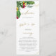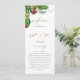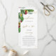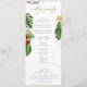Wedding program card with tropical design, tropical leaves, yellow & red floral, gold geometrics & calligraphy.