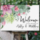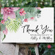 Welcome Thank You Palm Floral Tropical Wedding Foam Board. A 2-sided board with both a welcome sign and thank you sign! With pink and green botanical accents and purple lettering. A tropical design that embraces the tranquil beauty of nature mixed with a playful edge that is sure to help you have fun. A blend of calming green tropical leaves, including banana leaves, palms, monstera leaves, and pink princessa plants, alongside soothing purple-pink orchid flowers, intertwined with various other foliage. Enhanced by a modern handwritten or script typography font, this enchanting print radiates charm and sophistication. This versatile design brings a sense of tropical paradise to any setting or special occasion, making it perfect for a destination wedding, or just when you want to add a tropical flare.