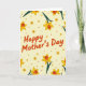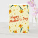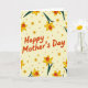 This greeting card features a soft parchment-yellow background filled with repeating trumpet-shaped spring flowers, creating a cozy, caring atmosphere ❤️. Centered on the front is the text “Happy Mother’s Day” in a warm orange display font that stands out clearly against the light backdrop. The flowers are mostly golden yellow with darker yellow outer petals and a small orange-red center, suggesting the gentle attention you’d give someone you cherish. Dark green stems arc upward and around the message, like a loose bouquet wrapping the words in a friendly embrace. Scattered between the larger blooms are smaller simple yellow flower marks and tiny rust-colored asterisk dots, adding a light sparkle 🌼. The layout keeps the greeting in the middle while the floral pattern repeats evenly around it, so the eye keeps coming back to the message. Several blossoms show teardrop-shaped orange-red centers nestled inside yellow petals, with curved green stems crossing softly behind the orange lettering.