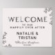This floral typography welcome wedding poster is perfect for an elegant wedding. The romantic design features simple lettering decorated with flowers, botanical edging, and a subtle blush background. Customize the poster with the name of the bride and groom, and the date and location of the wedding.