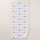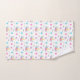Cute unicorn pattern bath towel set to decorate a kids bathroom. Design features a whimsical unicorn face and flowers in purple, pink and teal.