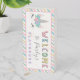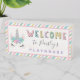 Welcome sign for your child's playhouse with a flower-crown wearing unicorn, WELCOME written in pastel-colored letters, and a pretty striped frame. Add your child's name in a lovely script.