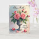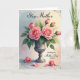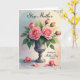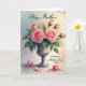 Designed with a romantic still-life feel, the card centers on a bouquet of blush pink roses nestled in a classic fluted urn shaded in muted silver. Some blooms are tight buds while others open wide with many soft petals, and the mix creates a tender, just-picked look ❤️. Deep green leaves with lightly jagged edges weave between the flowers, like they’re leaning in close to keep each other company. The background fades gently from pale sky blue to creamy ivory and warm pink, giving the scene a calm, early-morning glow. Decorative curled flourishes sit in the corners, framing the arrangement with an antique touch. Near the bottom, a short message appears in flowing lettering, set in a soft gray tone that doesn’t overpower the flowers 🌼. At the base of the urn, one full pink rose rests on the surface with a few loose petals scattered nearby.