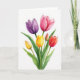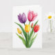 Designed with a watercolor look, the front shows five spring flowers on a plain white background, arranged like a small bouquet that feels shared between close friends 🌷. Near the top sit two large blossoms, one deep violet and one soft fuchsia, angled slightly toward each other as if leaning in for a quiet moment. Below them, a bright golden-yellow flower stands upright in the center, giving the layout a gentle balance. Two smaller buds sit nearby—one yellow and one red-orange—tucked close as though keeping each other company 🐇. Broad green leaves spread around the stems with visible brush marks, adding soft texture and a natural frame. The petals fade through lighter and darker tones, with subtle highlights that suggest calm, diffused light across the blooms. A short greeting appears in the upper area in a light gray color, while a smaller line of text sits near the bottom in matching gray, and the red-orange bud shows a darker edge along its tightly curled tip.