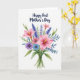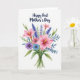 This card features a soft watercolor bouquet centered on a bright white background, arranged like a fresh gift offered with quiet affection ❤️. Several trumpet-shaped flowers in light to medium pink take the spotlight, and their golden-yellow centers draw the eye like little sparks of warmth. Around them sit spiky clusters of lavender-toned blooms and scattered small round petals in purple, blush, and pale sky-blue, giving the arrangement a friendly, close-knit feel. Green leaves in both broad shapes and fine fern-like sprigs, with touches of muted teal, frame the flowers and add gentle depth. The stems gather neatly at the bottom as if tied together, suggesting care and togetherness between giver and receiver 🌼. Near the top, a short message appears in flowing lettering, placed above the bouquet and colored deep indigo to echo the cooler tones below. The paint looks light and translucent, with soft edges where colors meet and blend. The indigo text sits centered above the blooms, while the tied stems form a small bundle at the base of the arrangement.